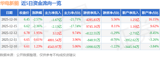 证券之星消息,截至2025年12月16日收盘,华电新能(600930)报收于6.45元,下跌2.57%,换手率4.73%,成交量118.49万手,成交额7.71亿元。