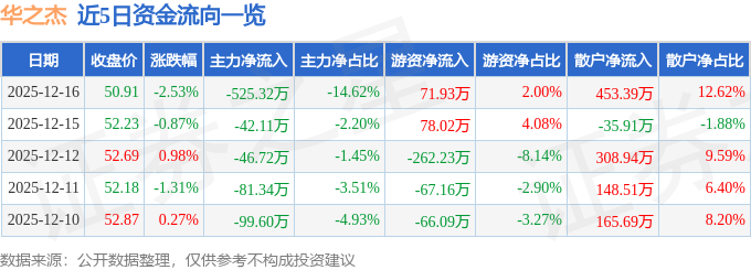证券之星消息,截至2025年12月16日收盘,华之杰(603400)报收于50.91元,下跌2.53%,换手率3.59%,成交量7042.0手,成交额3592.47万元。