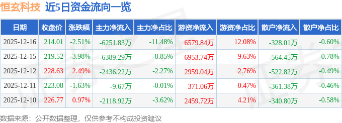 证券之星消息,截至2025年12月16日收盘,恒玄科技(688608)报收于214.01元,下跌2.51%,换手率1.5%,成交量2.53万手,成交额5.45亿元。
