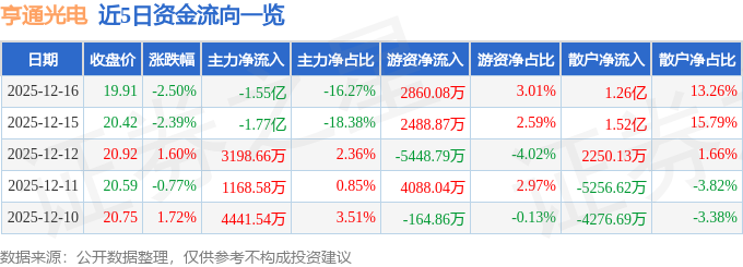 证券之星消息,截至2025年12月16日收盘,亨通光电(600487)报收于19.91元,下跌2.5%,换手率1.95%,成交量47.68万手,成交额9.51亿元。