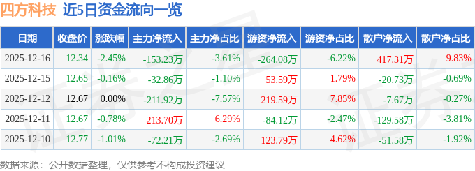 12月16日的资金流向数据方面,主力资金净流出153.23万元,占总成交额3.61%,游资资金净流出264.08万元,占总成交额6.22%,散户资金净流入417.31万元,占总成交额9.83%。