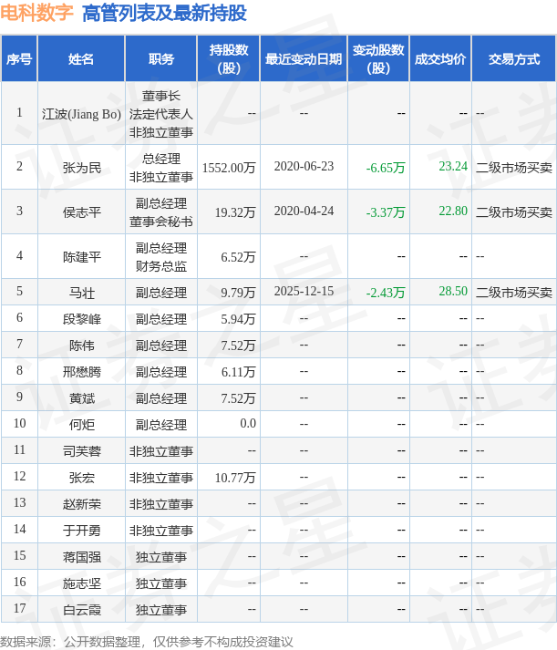 电科数字近半年内的董监高及核心技术人员增减持详情如下: