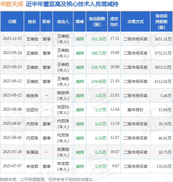 华胜天成近半年内的董监高及核心技术人员增减持详情如下: