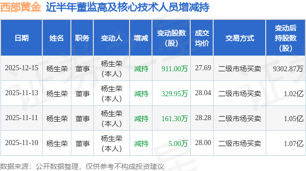 证券之星消息,根据12月16日市场公开信息、上市公司公告及交易所披露数据整理,西部黄金(601069)最新董监高及相关人员股份变动情况:2025年12月15日公司董事杨生荣共减持公司股份911.0万股,占公司总股本为1.0%。变动期间公司股价上涨2.8%,12月15日当日收盘报28.25元。