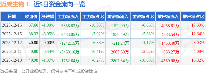 证券之星消息,截至2025年12月16日收盘,迈威生物(688062)报收于37.6元,下跌1.9%,换手率3.02%,成交量6.17万手,成交额2.33亿元。
