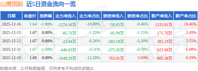 证券之星消息,截至2025年12月16日收盘,山鹰国际(600567)报收于1.64元,下跌1.8%,换手率1.23%,成交量77.39万手,成交额1.27亿元。