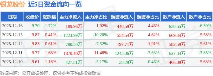 证券之星消息,截至2025年12月16日收盘,银龙股份(603969)报收于9.7元,下跌1.72%,换手率1.2%,成交量10.16万手,成交额9868.32万元。