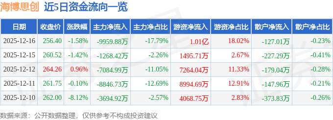 12月16日的资金流向数据方面,主力资金净流出9959.88万元,占总成交额17.79%,游资资金净流入1.01亿元,占总成交额18.02%,散户资金净流出127.01万元,占总成交额0.23%。