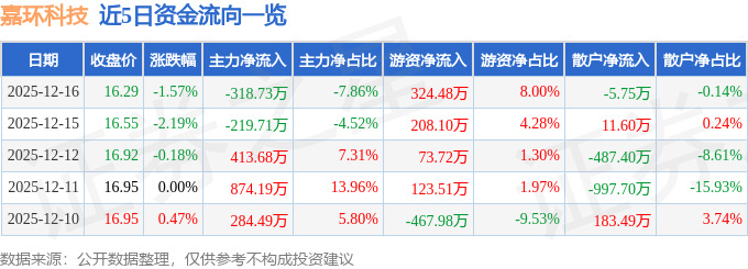 证券之星消息,截至2025年12月16日收盘,嘉环科技(603206)报收于16.29元,下跌1.57%,换手率0.81%,成交量2.49万手,成交额4056.34万元。