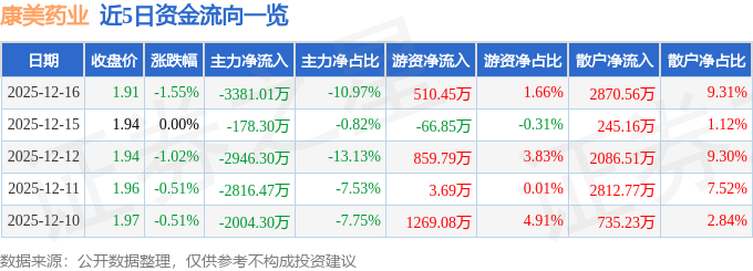证券之星消息,截至2025年12月16日收盘,康美药业(600518)报收于1.91元,下跌1.55%,换手率1.16%,成交量160.31万手,成交额3.08亿元。