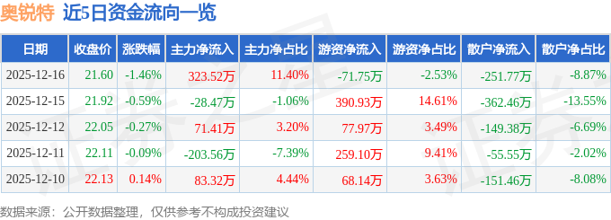 12月16日的资金流向数据方面,主力资金净流入323.52万元,占总成交额11.4%,游资资金净流出71.75万元,占总成交额2.53%,散户资金净流出251.77万元,占总成交额8.87%。