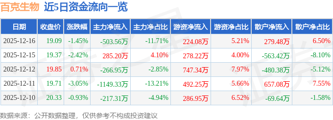 证券之星消息,截至2025年12月16日收盘,百克生物(688276)报收于19.09元,下跌1.45%,换手率0.54%,成交量2.25万手,成交额4301.75万元。
