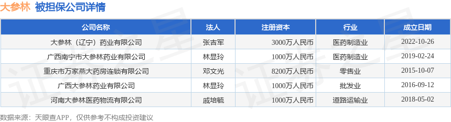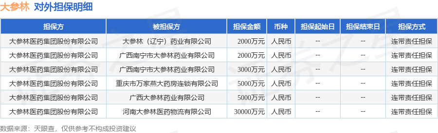 大参林12月15日披露6笔对外担保,被担保公司5家。对外担保明细如下表: