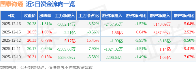 证券之星消息,截至2025年12月16日收盘,国泰海通(601211)报收于20.28元,下跌1.31%,换手率0.59%,成交量78.98万手,成交额16.14亿元。