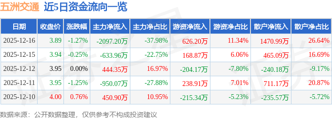 证券之星消息,截至2025年12月16日收盘,五洲交通(600368)报收于3.89元,下跌1.27%,换手率0.88%,成交量14.13万手,成交额5521.4万元。