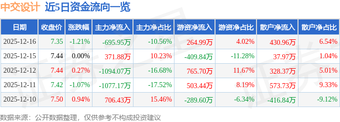 12月16日的资金流向数据方面,主力资金净流出695.95万元,占总成交额10.56%,游资资金净流入264.99万元,占总成交额4.02%,散户资金净流入430.96万元,占总成交额6.54%。