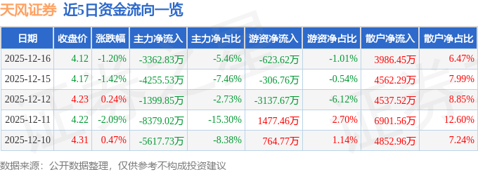 证券之星消息,截至2025年12月16日收盘,天风证券(601162)报收于4.12元,下跌1.2%,换手率1.74%,成交量149.5万手,成交额6.16亿元。