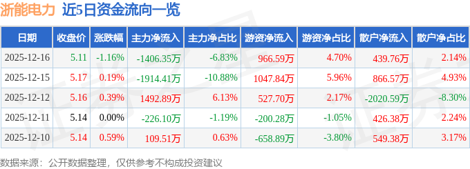 证券之星消息,截至2025年12月16日收盘,浙能电力(600023)报收于5.11元,下跌1.16%,换手率0.3%,成交量40.18万手,成交额2.06亿元。