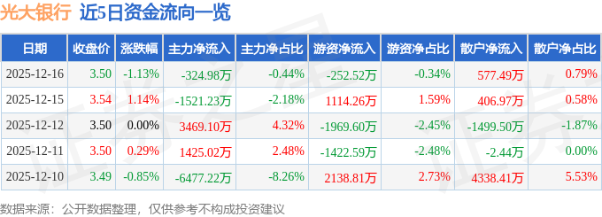 证券之星消息,截至2025年12月16日收盘,光大银行(601818)报收于3.5元,下跌1.13%,换手率0.45%,成交量209.4万手,成交额7.35亿元。