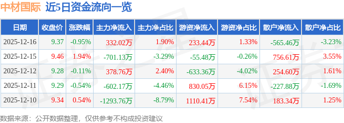 证券之星消息,截至2025年12月16日收盘,中材国际(600970)报收于9.37元,下跌0.95%,换手率0.83%,成交量18.67万手,成交额1.75亿元。