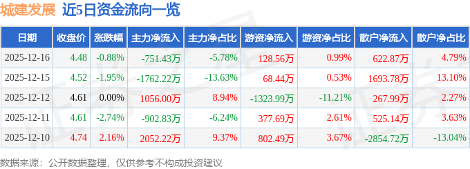 证券之星消息,截至2025年12月16日收盘,城建发展(600266)报收于4.48元,下跌0.88%,换手率1.39%,成交量28.84万手,成交额1.3亿元。