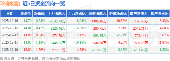 证券之星消息,截至2025年12月16日收盘,玲珑轮胎(601966)报收于14.7元,下跌0.74%,换手率0.62%,成交量9.1万手,成交额1.34亿元。