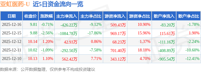 证券之星消息,截至2025年12月16日收盘,亚虹医药(688176)报收于9.81元,下跌0.71%,换手率1.09%,成交量4.76万手,成交额4672.01万元。