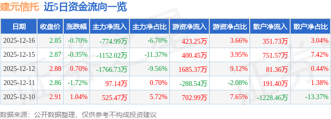 证券之星消息,截至2025年12月16日收盘,建元信托(600816)报收于2.85元,下跌0.7%,换手率0.74%,成交量40.56万手,成交额1.16亿元。