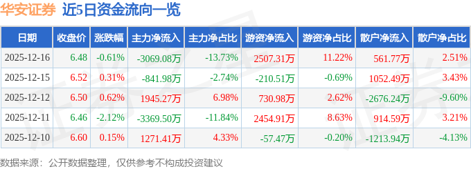 证券之星消息,截至2025年12月16日收盘,华安证券(600909)报收于6.48元,下跌0.61%,换手率0.74%,成交量34.45万手,成交额2.24亿元。