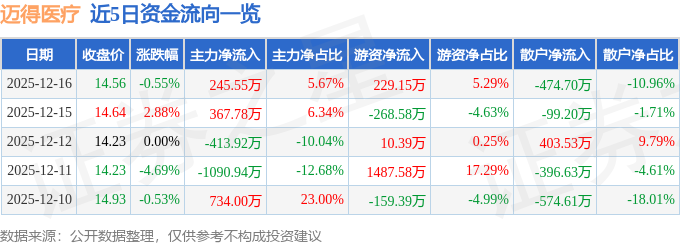证券之星消息,截至2025年12月16日收盘,迈得医疗(688310)报收于14.56元,下跌0.55%,换手率1.78%,成交量2.96万手,成交额4332.23万元。