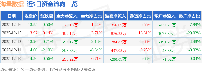 证券之星消息,截至2025年12月16日收盘,海量数据(603138)报收于13.85元,下跌0.5%,换手率1.37%,成交量3.95万手,成交额5433.45万元。