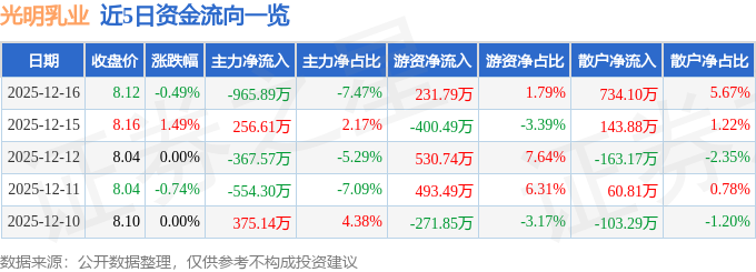 证券之星消息,截至2025年12月16日收盘,光明乳业(600597)报收于8.12元,下跌0.49%,换手率1.15%,成交量15.81万手,成交额1.29亿元。