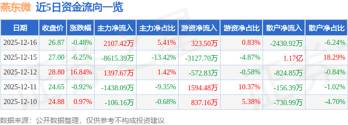 证券之星消息,截至2025年12月16日收盘,燕东微(688172)报收于26.87元,下跌0.48%,换手率1.84%,成交量14.29万手,成交额3.89亿元。