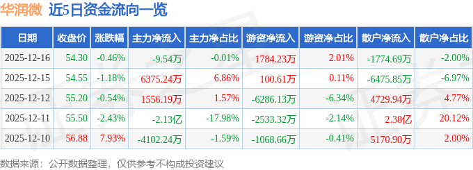 证券之星消息,截至2025年12月16日收盘,华润微(688396)报收于54.3元,下跌0.46%,换手率1.22%,成交量16.24万手,成交额8.87亿元。