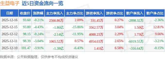证券之星消息,截至2025年12月16日收盘,生益电子(688183)报收于93.6元,下跌0.21%,换手率1.57%,成交量13.02万手,成交额12.27亿元。
