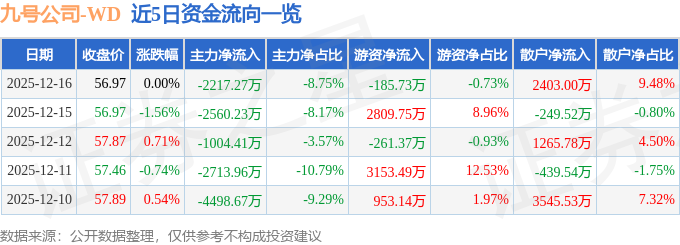 证券之星消息,截至2025年12月16日收盘,九号公司(689009)报收于56.97元,上涨0.0%,换手率0.8%,成交量4.45万手,成交额2.54亿元。