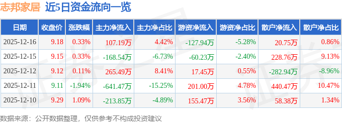 证券之星消息,截至2025年12月16日收盘,志邦家居(603801)报收于9.18元,上涨0.33%,换手率0.61%,成交量2.65万手,成交额2423.81万元。