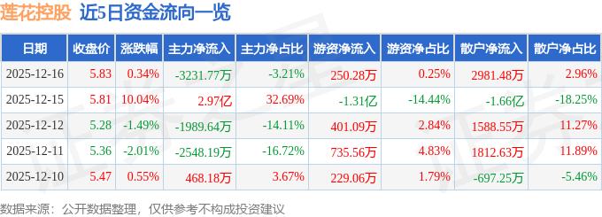 证券之星消息,截至2025年12月16日收盘,莲花控股(600186)报收于5.83元,上涨0.34%,换手率9.57%,成交量171.29万手,成交额10.06亿元。