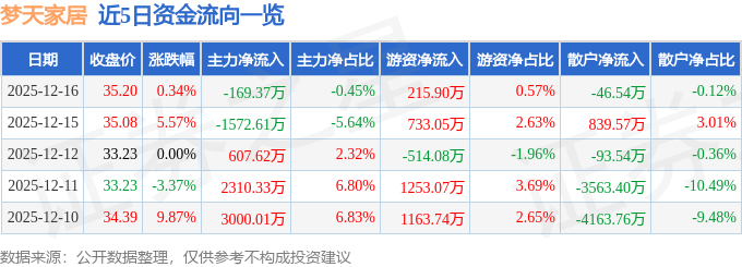 证券之星消息,截至2025年12月16日收盘,梦天家居(603216)报收于35.2元,上涨0.34%,换手率4.69%,成交量10.45万手,成交额3.76亿元。