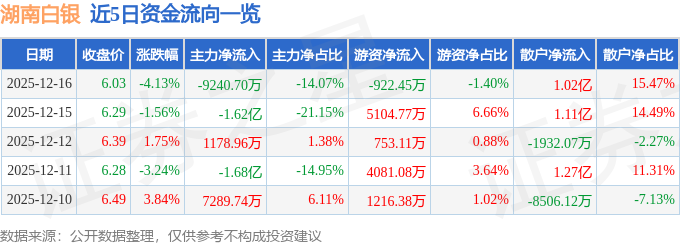 证券之星消息,截至2025年12月16日收盘,湖南白银(002716)报收于6.03元,下跌4.13%,换手率4.64%,成交量107.82万手,成交额6.57亿元。