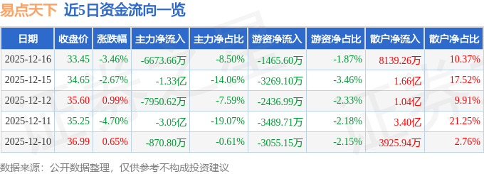 证券之星消息,截至2025年12月16日收盘,易点天下(301171)报收于33.45元,下跌3.46%,换手率6.1%,成交量23.25万手,成交额7.85亿元。