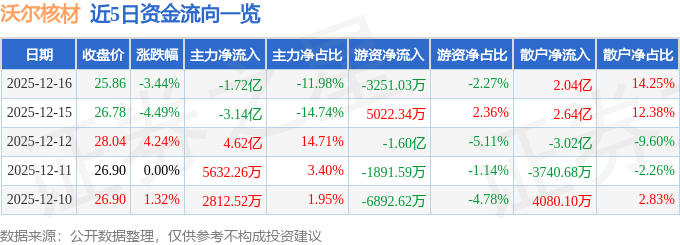 证券之星消息,截至2025年12月16日收盘,沃尔核材(002130)报收于25.86元,下跌3.44%,换手率4.81%,成交量55.05万手,成交额14.32亿元。