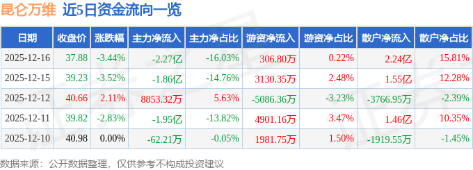 证券之星消息,截至2025年12月16日收盘,昆仑万维(300418)报收于37.88元,下跌3.44%,换手率2.96%,成交量37.1万手,成交额14.16亿元。
