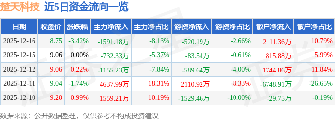 12月16日的资金流向数据方面,主力资金净流出1591.18万元,占总成交额8.13%,游资资金净流出520.19万元,占总成交额2.66%,散户资金净流入2111.36万元,占总成交额10.79%。