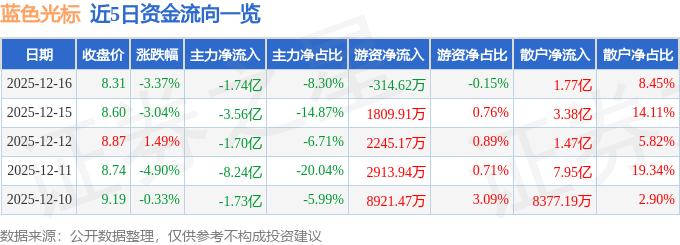 证券之星消息,截至2025年12月16日收盘,蓝色光标(300058)报收于8.31元,下跌3.37%,换手率7.21%,成交量251.0万手,成交额20.97亿元。