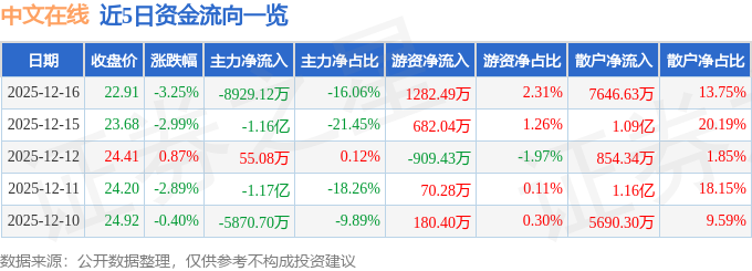 证券之星消息,截至2025年12月16日收盘,中文在线(300364)报收于22.91元,下跌3.25%,换手率3.64%,成交量24.05万手,成交额5.56亿元。