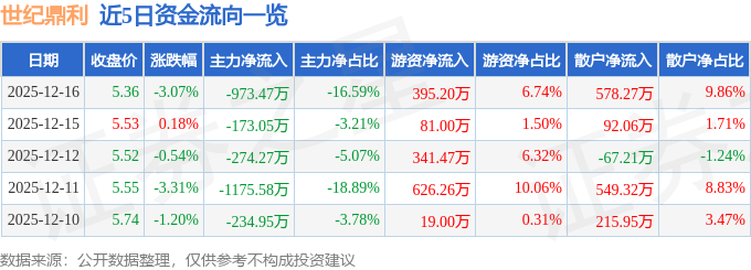 证券之星消息,截至2025年12月16日收盘,世纪鼎利(300050)报收于5.36元,下跌3.07%,换手率1.99%,成交量10.85万手,成交额5866.22万元。