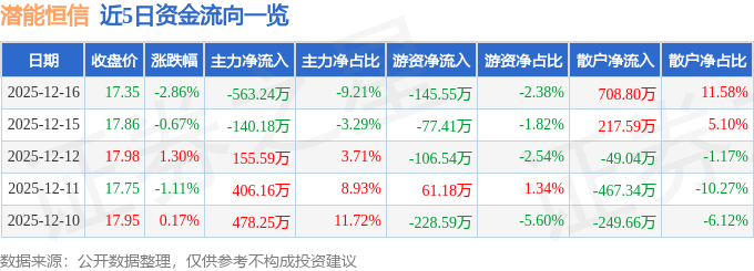 12月16日的资金流向数据方面,主力资金净流出563.24万元,占总成交额9.21%,游资资金净流出145.55万元,占总成交额2.38%,散户资金净流入708.8万元,占总成交额11.58%。