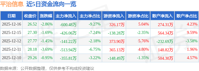 证券之星消息,截至2025年12月16日收盘,平治信息(300571)报收于26.52元,下跌2.86%,换手率2.09%,成交量2.42万手,成交额6477.6万元。
