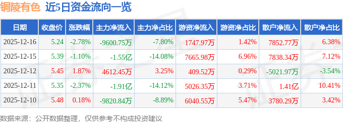 证券之星消息,截至2025年12月16日收盘,铜陵有色(000630)报收于5.24元,下跌2.78%,换手率2.1%,成交量233.64万手,成交额12.3亿元。